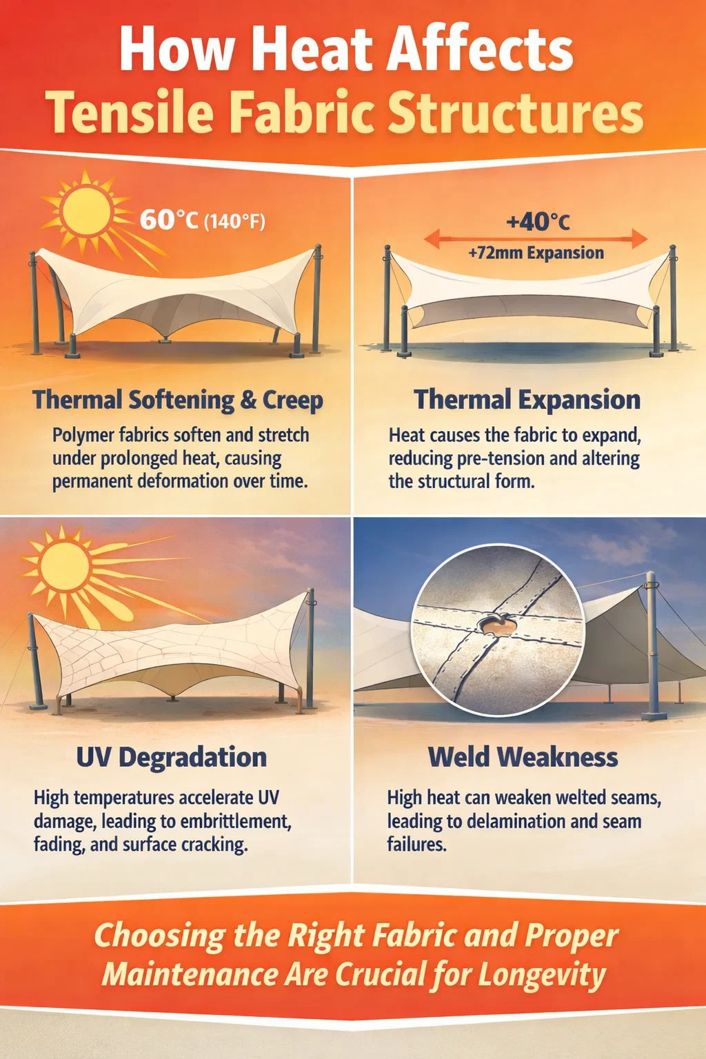 Тепло влияет на растяжимую ткань тремя различными способами: оно смягчает материал, ускоряет разрушение под воздействием ультрафиолета и вызывает расширение размеров, которое изменяет предварительное натяжение, заложенное в конструкцию. Понимание каждого из этих механизмов поможет вам выбрать правильную структуру и установить реалистичные ожидания по обслуживанию.