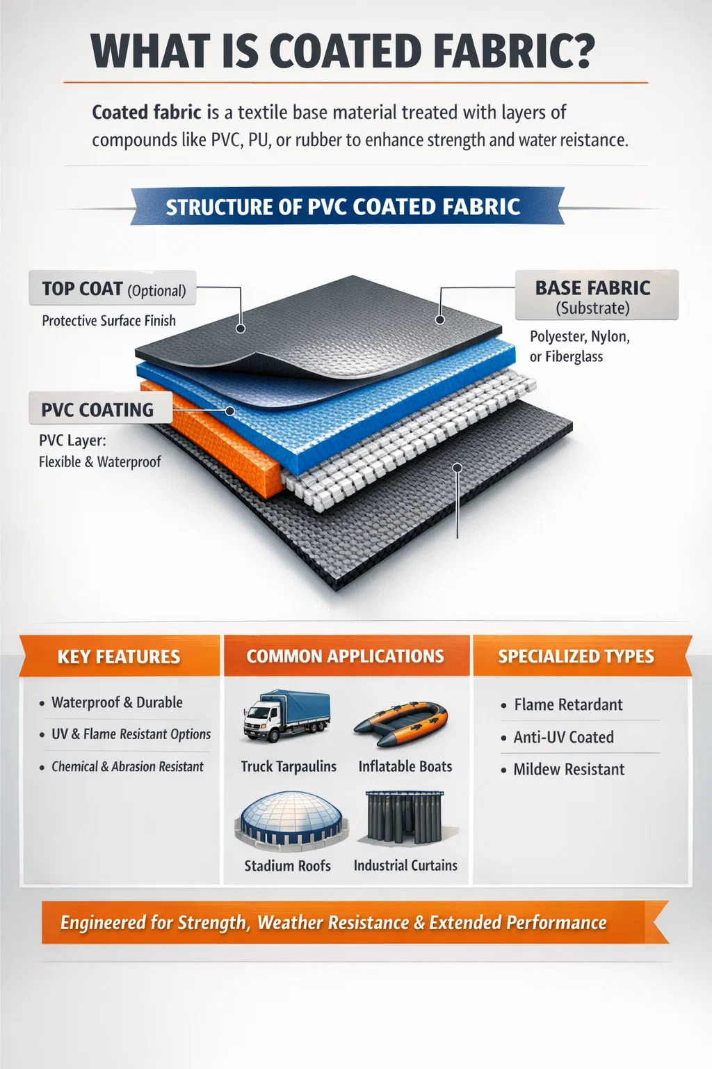 Coated fabric is a textile material that has been treated with one or more layers of a chemical compound — most commonly PVC (polyvinyl chloride), polyurethane (PU), acrylic, or rubber — applied directly to one or both surfaces of a base fabric. The coating bonds with the substrate to produce a composite material that is stronger, more water-resistant, more durable, and more functional than the uncoated base textile alone.