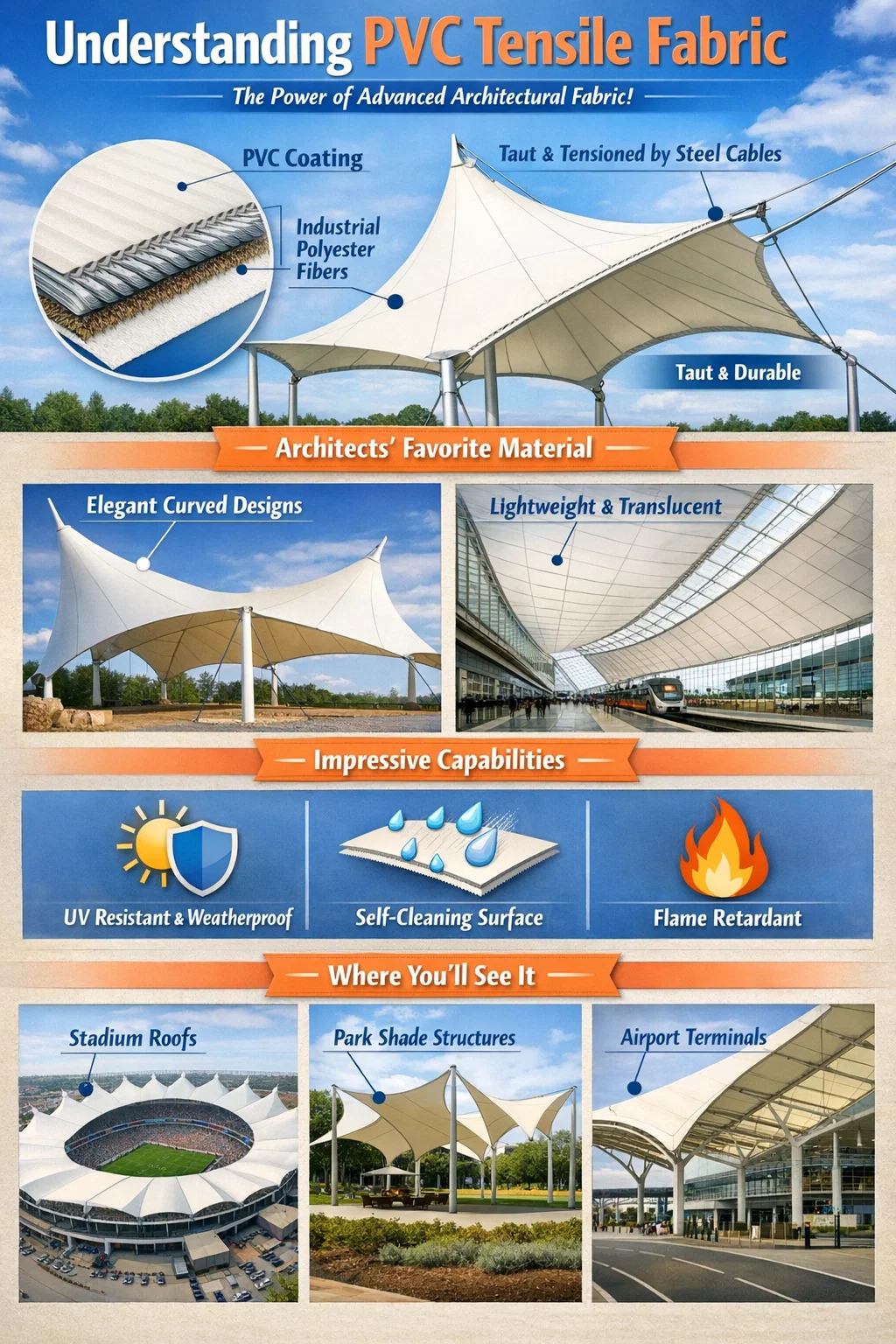 Универсальные формы: его можно растягивать в форме седла, палатки или различных элегантных изгибов. Вы часто увидите эти художественные формы на стадионах, в театрах под открытым небом или на роскошных парковках.