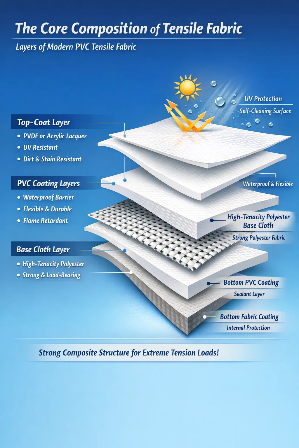 Самый современный эластичная ткань ПВХ представляет собой сложный композитный материал, состоящий из трех основных слоев: высокопрочная полиэфирная основа , толстый Покрытие ПВХ (поливинилхлорид) и специализированный верхний лак например, ПВДФ или акрил. Внутренняя ткань обеспечивает структурную прочность, позволяющую выдерживать огромные растягивающие нагрузки, а внешние пластиковые слои защищают волокна от разрушения окружающей среды, воды и огня.